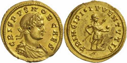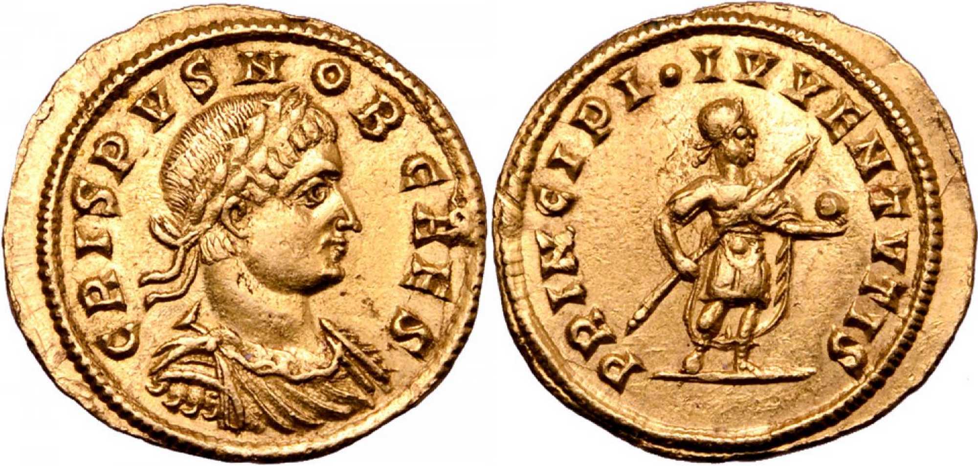 CRISPVSNOBCAES [CRISPVS NOB CAES]; bust r., laur., dr., cuir.