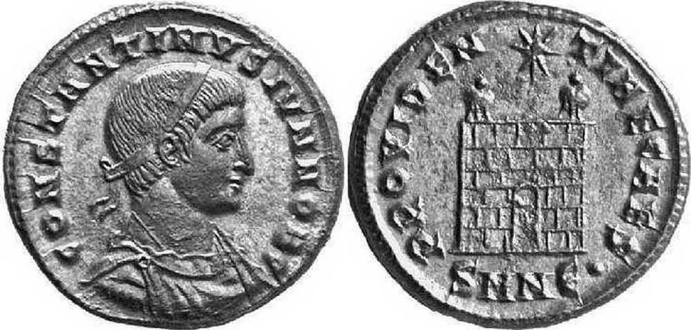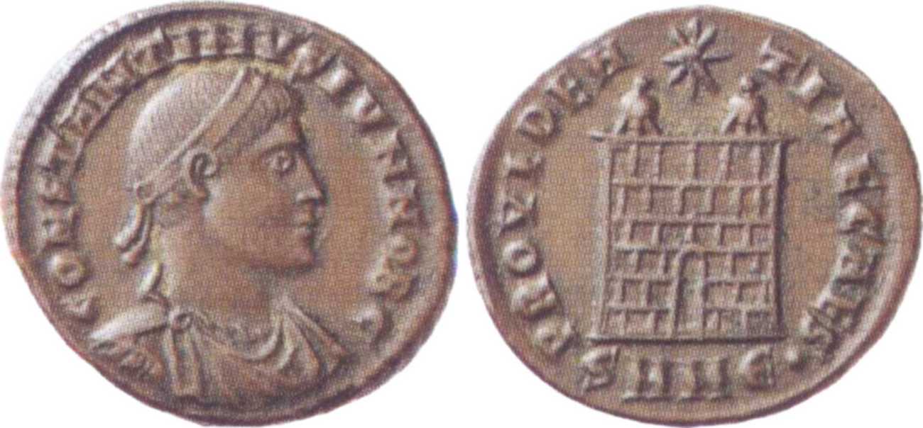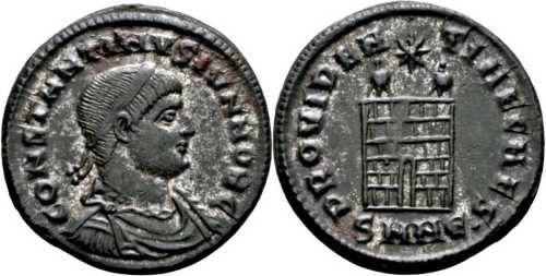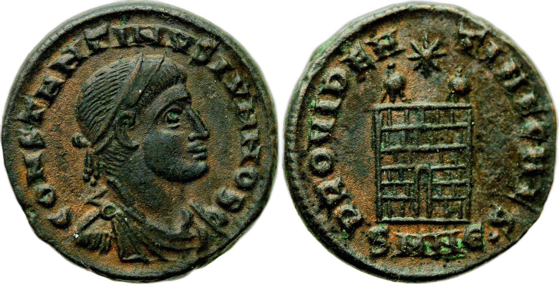 PROVIDEN-TIAECAES [PROVIDENTIAE CAES]; camp gate, two turrets, no doors, star above, varying number of stone layers. SMNЄ in exergue.