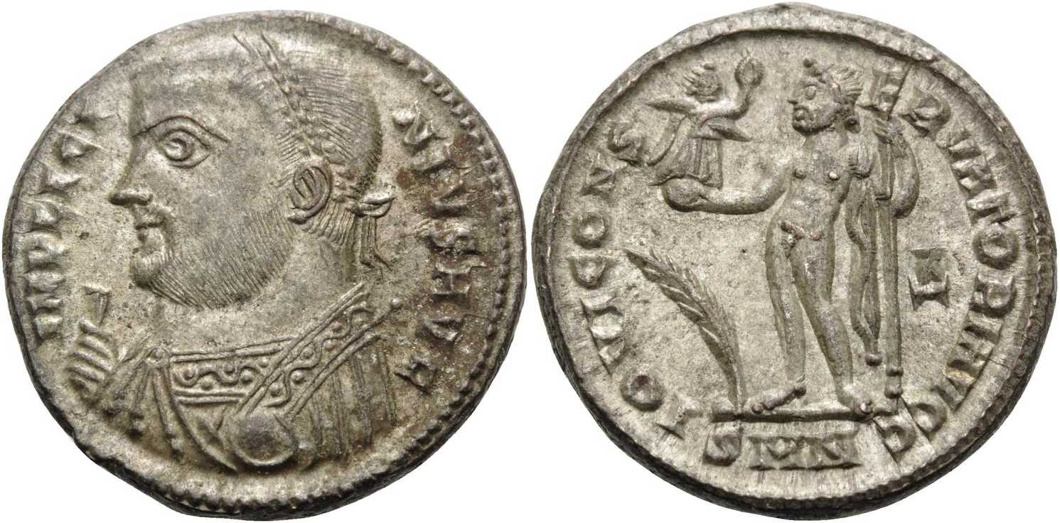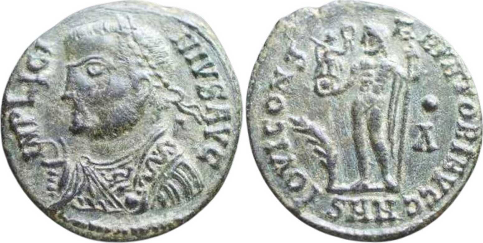 IMPLICI-NIVSAVG [IMP LICINIVS AVG]; bust l., laur., dr., globe, sceptre in l. hand, mappa in r. hand.