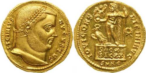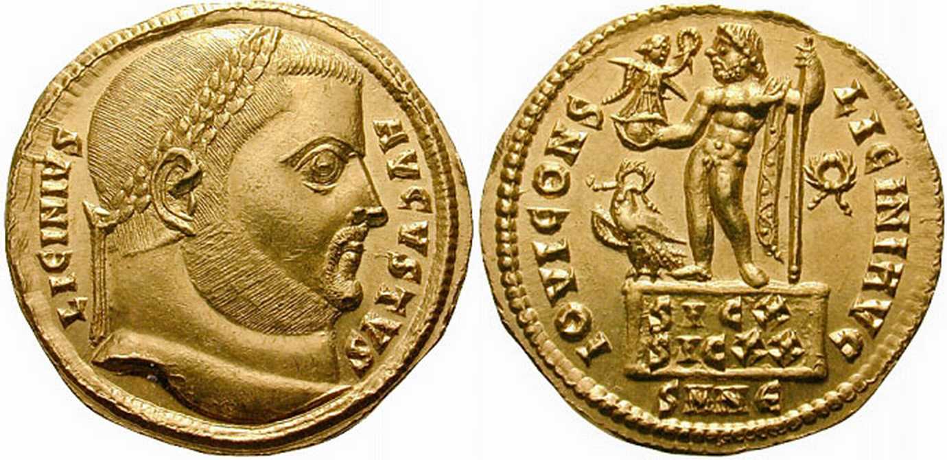 IOVICONS-LICINIAVG [IOVI CONS LICINI AVG]; Jupiter stg. l. on platform, chlamys across l. shoulder, holding Victory on globe, leaning on sceptre; at feet, eagle with wreath; SIC X/SIC XX on face of platform. Wreath in right field. SMNЄ in exergue.