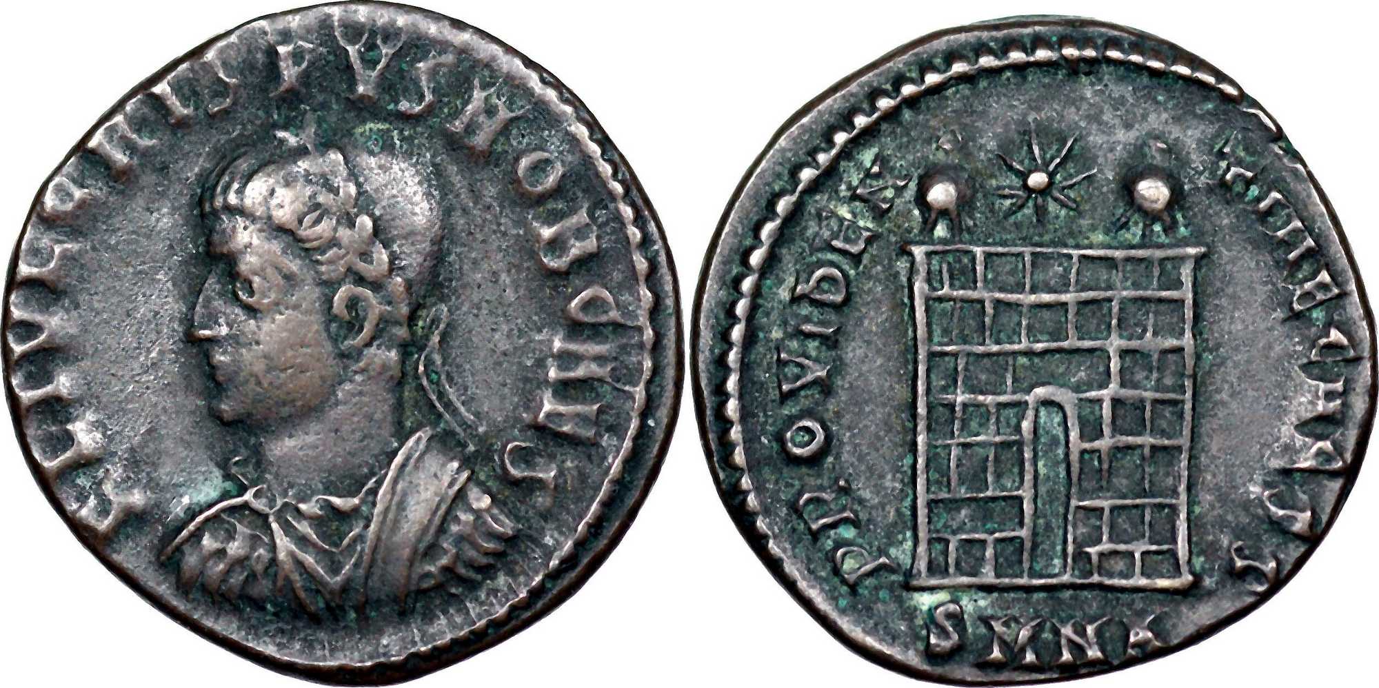 PROVIDEN-TIAECAVSS [PROVIDENTIAE CAVSS (sic!)]; camp gate, two turrets, no doors, star above, varying number of stone layers. SMNA in exergue.