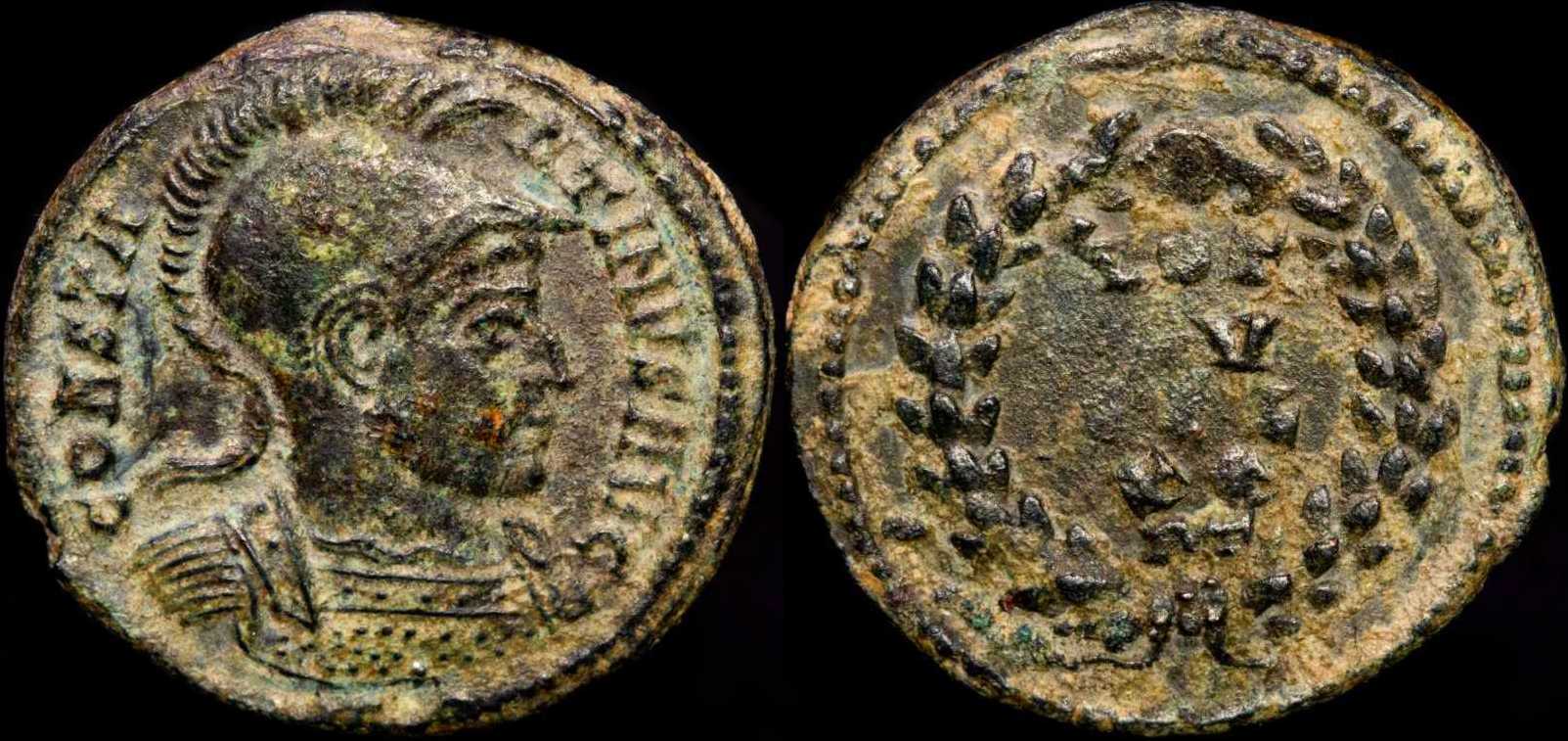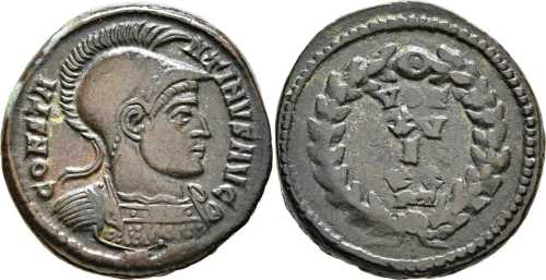 CONSTA-NTINVSAVG [CONSTANTINVS AVG]; bust r., helmeted, cuir. [D2].