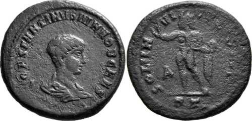 SOLIIN-VI-CT[OCOMITI] [SOLI INVICTO COMITI]; Sol rad., stg. l., raising r. hand, globe in l., chlamys across l. shoulder. A in left field. RT in exergue.