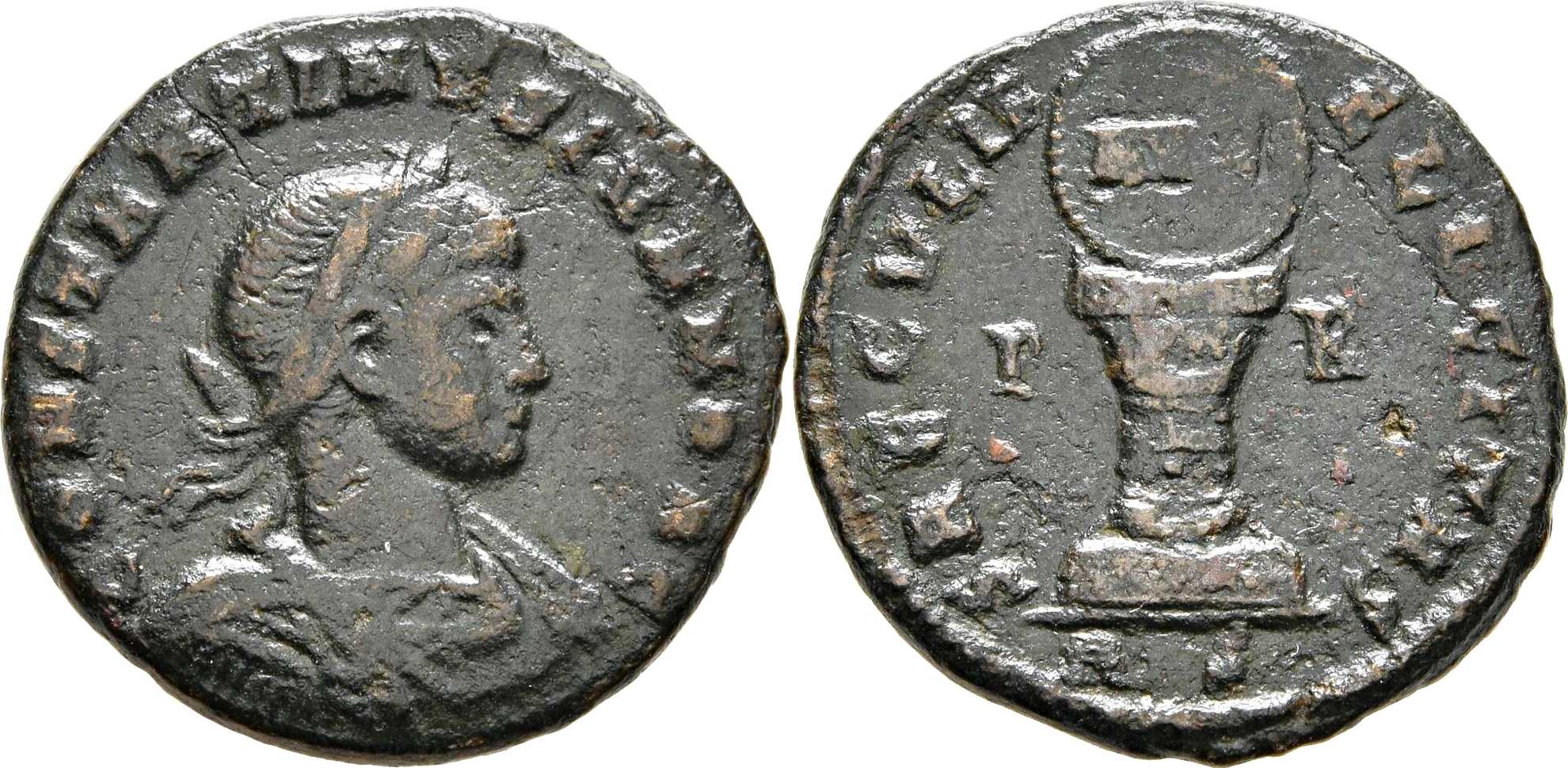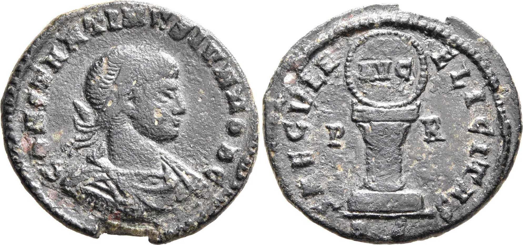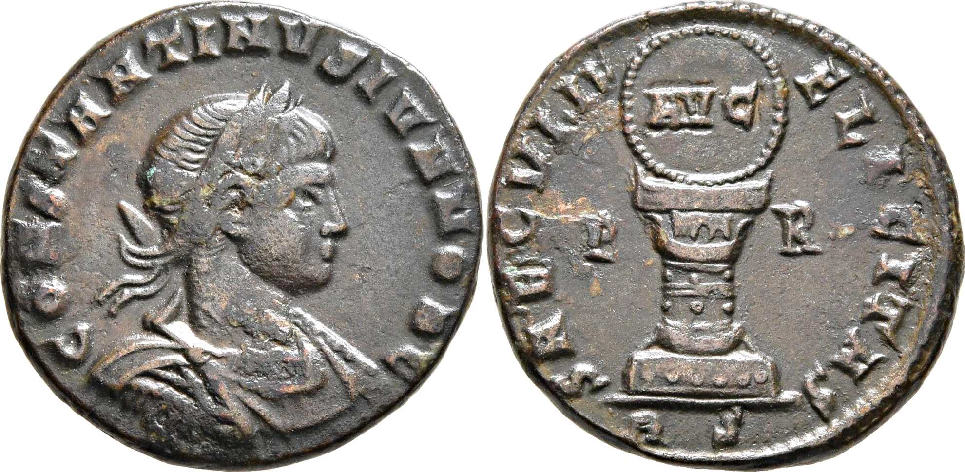 SAECVLIF-ELICITAS [SAECVLI FELICITAS]; shield with AVG on cippus, decorated with garland. P in left field, R in right field. RS in exergue.