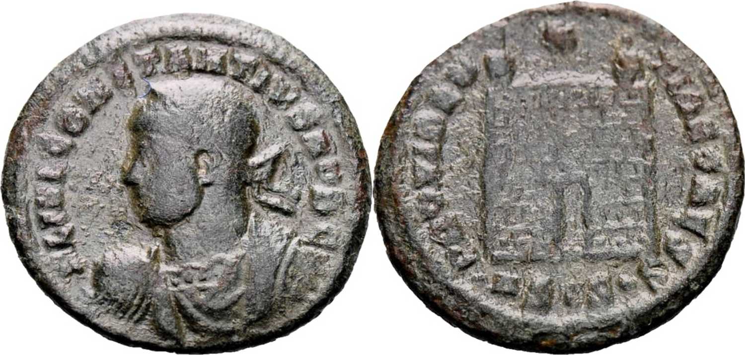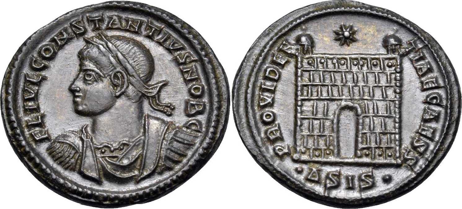 PROVIDEN-TIAECAESS [PROVIDENTIAE CAESS]; camp gate, two turrets, no doors, star above; varying number of stone layers. ΔSIS in exergue.