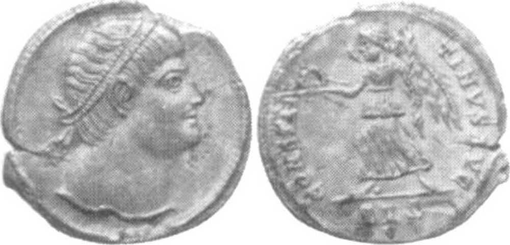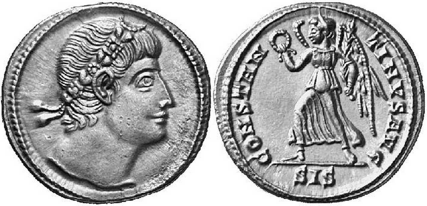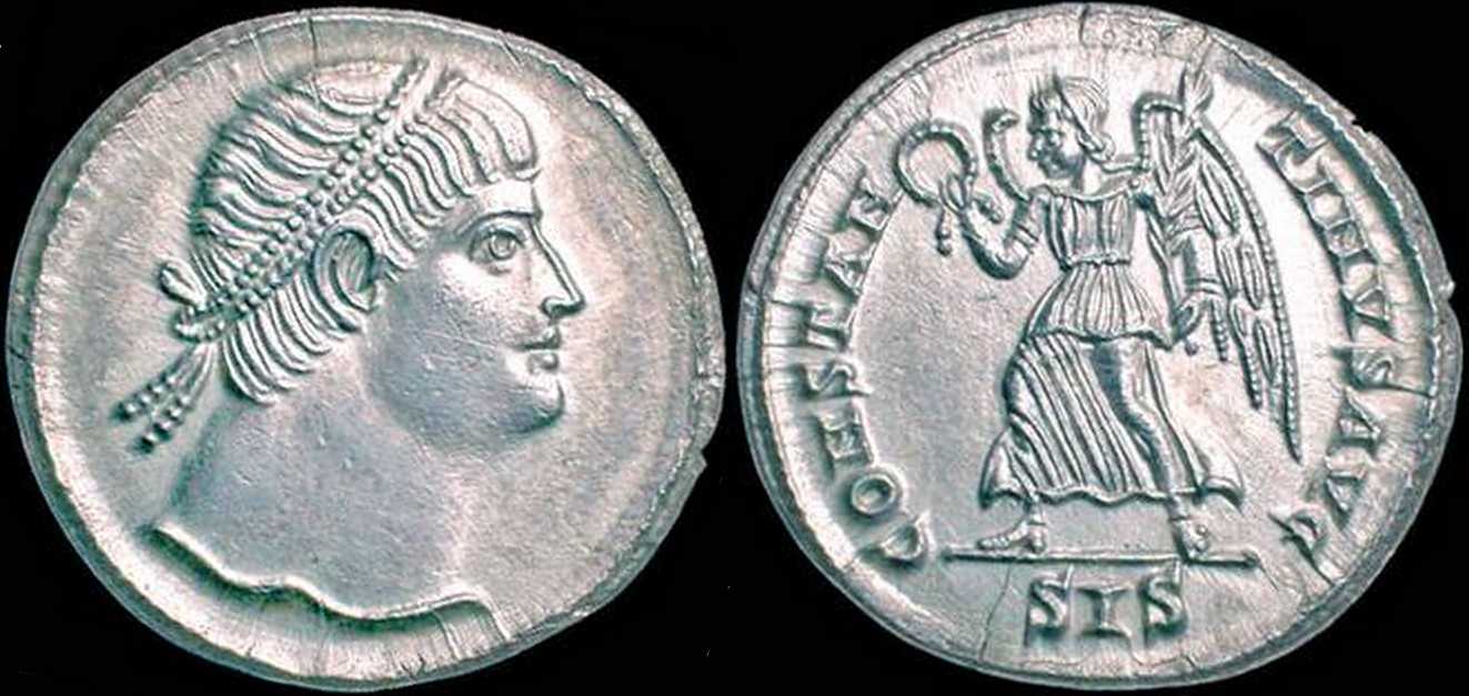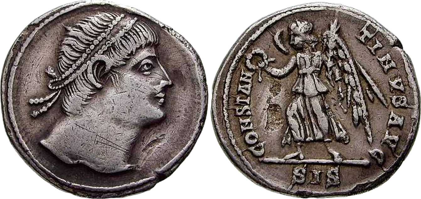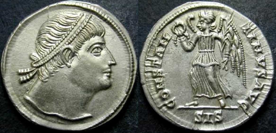 - from Bellinger, A. R., Bruun, P., Kent, J. P. C., Sutherland, C. H. V., "Late Roman Gold and Silver Coins at Dumbarton Oaks: Diocletian to Eugenius", Dumbarton Oaks Papers, Vol. 18 (1964), p. 179, no. 45; weight 3.045 g [click for picture]. See Bruun's opinion there: "The pearl diadem suggests Constantine II as Augustus, but the short hair on the nape of the neck indicates Constantine I". Note also that the specimen from Dumbarton Oaks is cited in RIC VII as SISCIA 229 (p. 455), i.e. as with rosette-diadem (sic!);