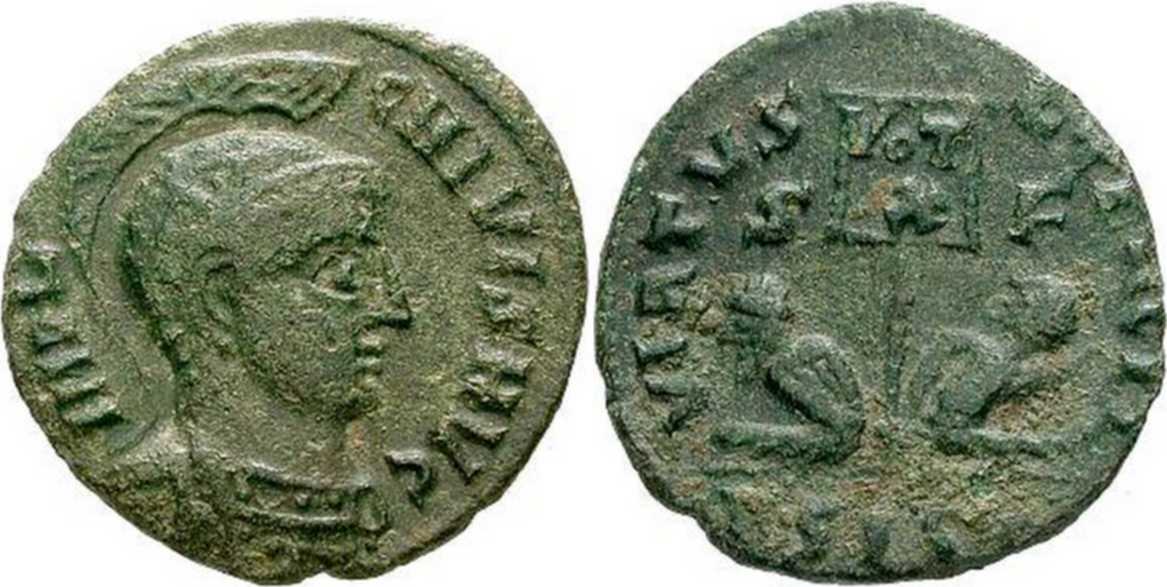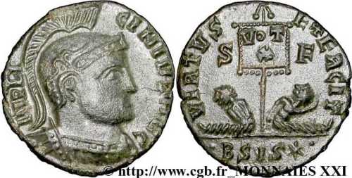 VIRTVS-EXERCIT [VIRTVS EXERCIT]; standard inscribed VOT/X; captive std. on ground on either side. S in left field, F in right field. B SIS* in exergue.