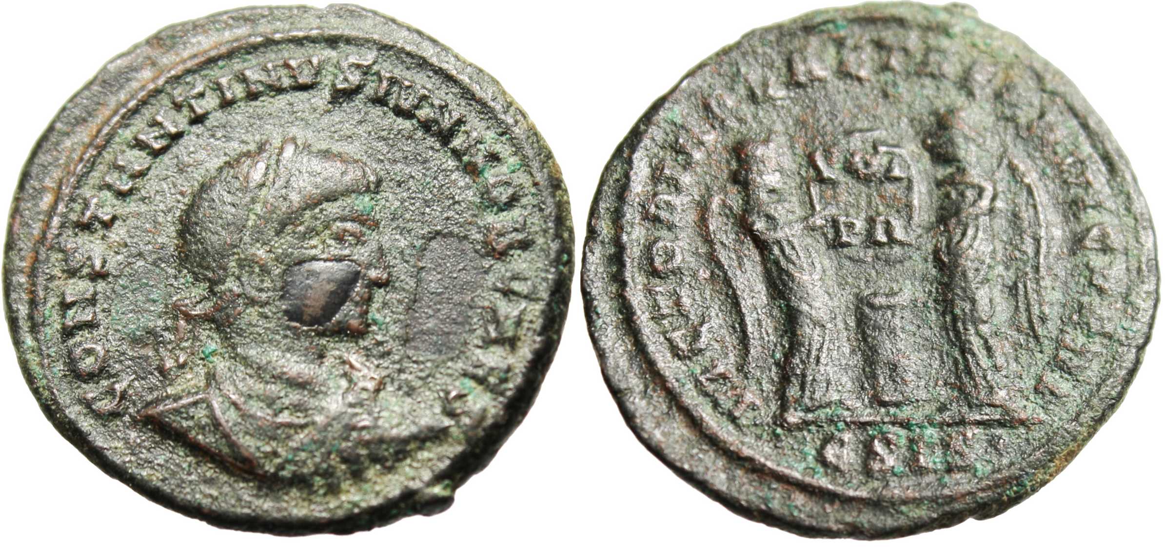 VICTORIAELAETAEPRINCPERP [VICTORIAE LAETAE PRINC PERP]; two Victories stg. facing one another, together holding shield inscribed VOT/PR on altar of varying design. ЄSIS in exergue.