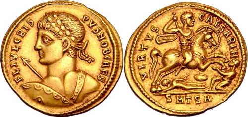 FLIVLCRIS-PVSNOBCAES [FL IVL CRISPVS NOB CAES]; bust l., heroic (nude), laur., spear pointing forward, shield on l. arm.