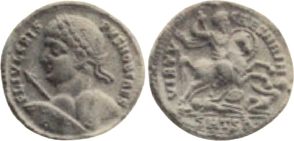 VIRTVS-CAESARIN [VIRTVS CAESARI N]; prince holding shield on arm, cloak flying, galloping r., charging kneeling enemy with spear; under horse, another enemy with shield. SMTSA in exergue.
