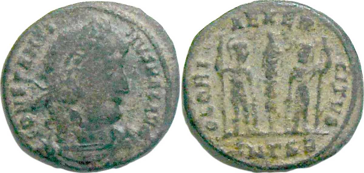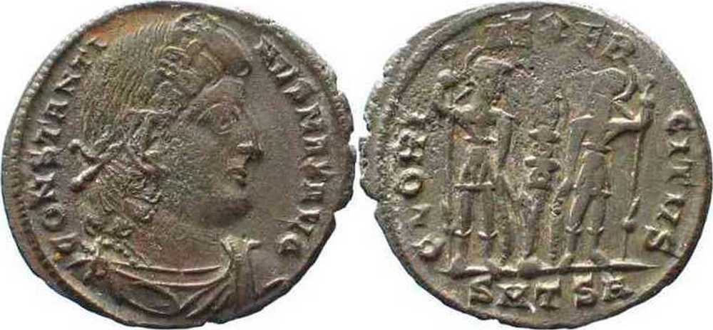 GLORI-AEXER-CITVS [GLORIA EXERCITVS]; two soldiers, helmeted, stg. looking at one another, reversed spear in outer hand, inner hand on shield resting on ground; between them, one standard. SMTSB in exergue.