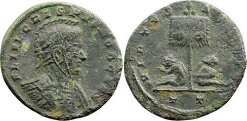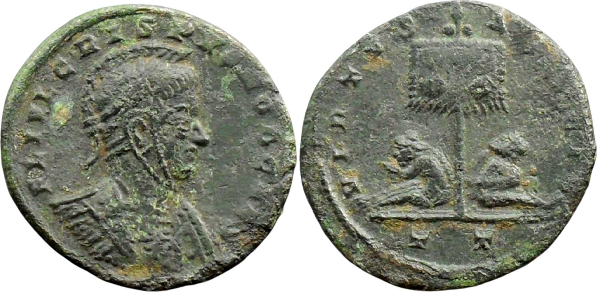 UNLISTED OBVERSE LEGEND AND BUST TYPE - D6. RIC lists only shorter obv. legend: CRISPVS NOB CAES and bust type G8 l. (p. 377). But see footnote 117 on p. 377: "Maur., loc. cit. [Maurice, Numismatique constantinienne], rev. II. 5, records an obv. 5 (D2) off. T in Vo. [Voetter]: not in V [Vienna]. Further he gives (loc. cit., rev. II. 6) the obv. FL IVL CRISPVS NOB CAES (D2) off. T, reffering to L, Gnecchi, without specyfying m.m., not to be found". Note, however, that this specimen may be regarded as an ancient imitation. Otherwise, should be listed before TICINUM 117.