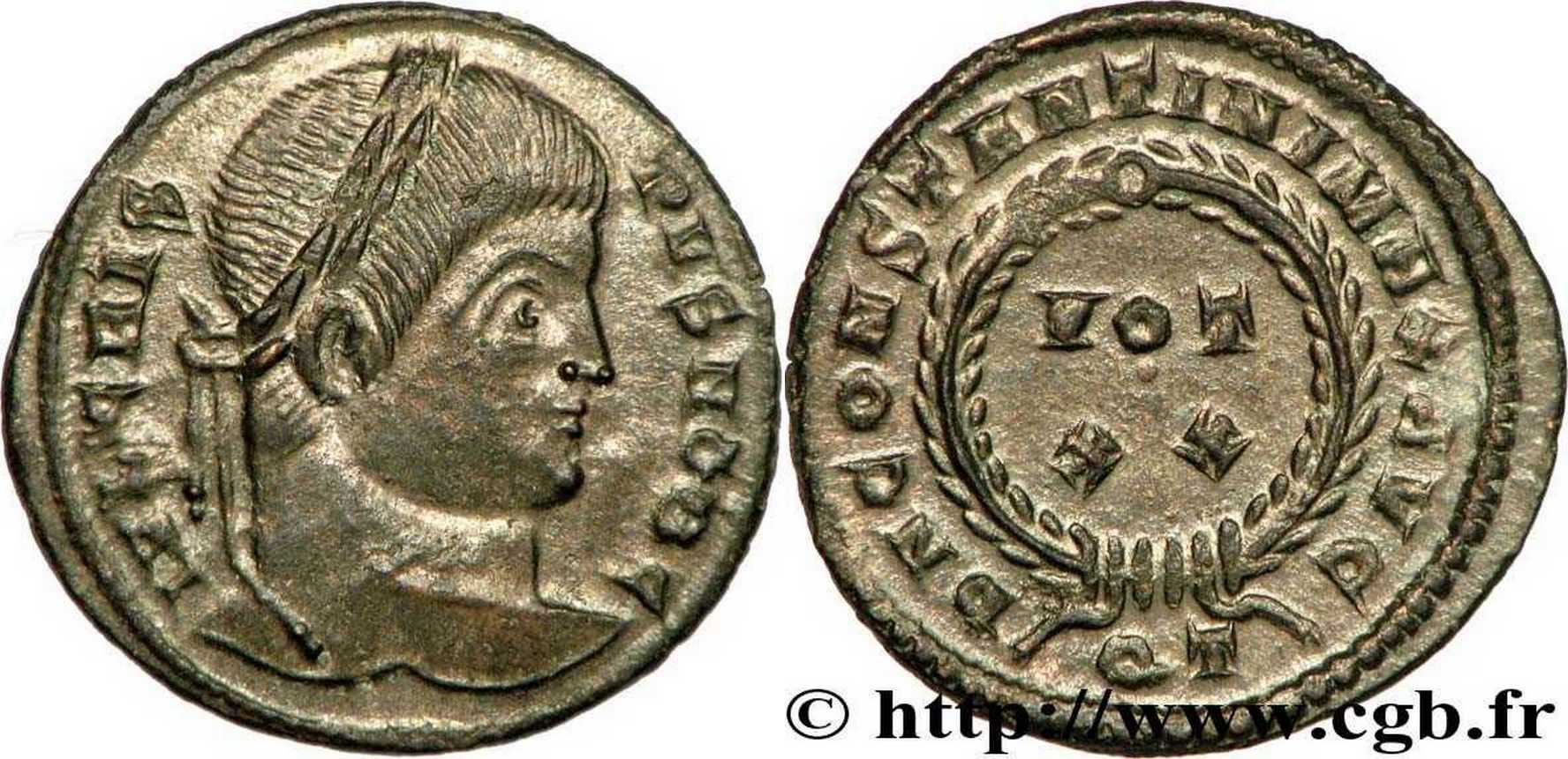 DNCONSTANTINIMAXAVG [D N CONSTANTINI MAX AVG]; laurel wreath enclosing VOT/XX. QT in exergue.
