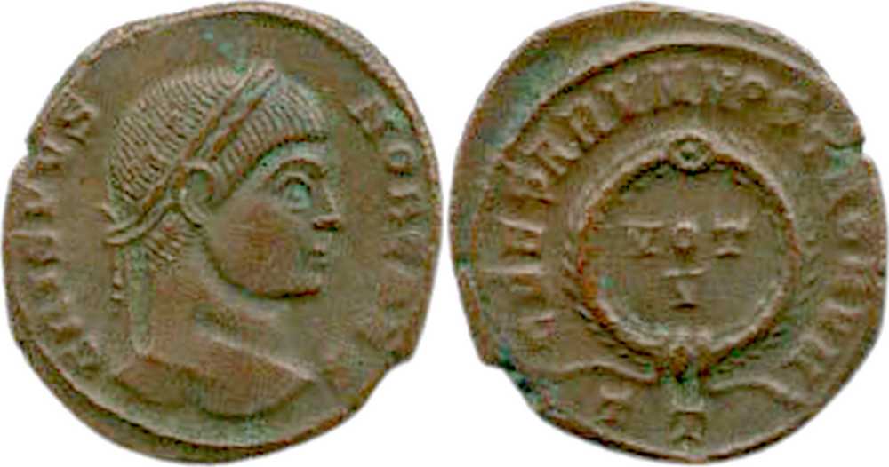 CAESARVMNOSTRORVM [CAESARVM NOSTRORVM]; laurel wreath enclosing VOT/V. TT in exergue.