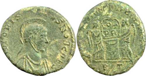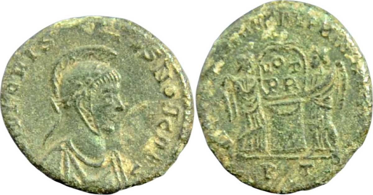 UNLISTED OBVERSE LEGEND AND BUST TYPE. Bust type not attested in RIC VII. RIC lists for Crispus shorter obv. legend ...NOB C (p. 373). But note crude style, light weight and small size. Apparently an ancient imitation.