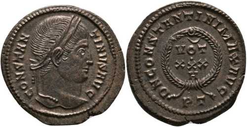 DNCONSTANTINIMAXAVG [D N CONSTANTINI MAX AVG]; laurel wreath enclosing VOT/XXX. In middle field, crescent over VOT and H under XXX. PT in exergue.