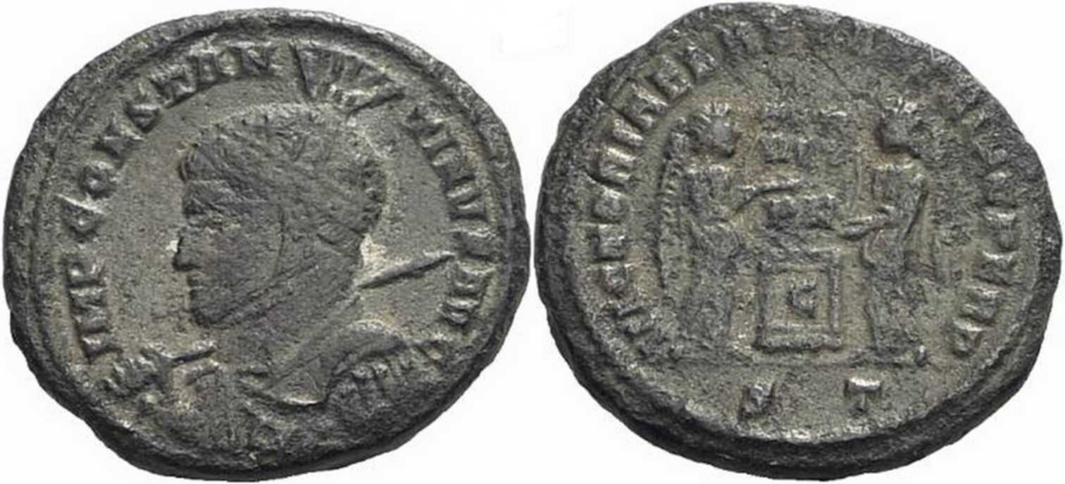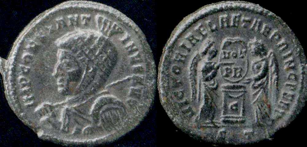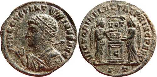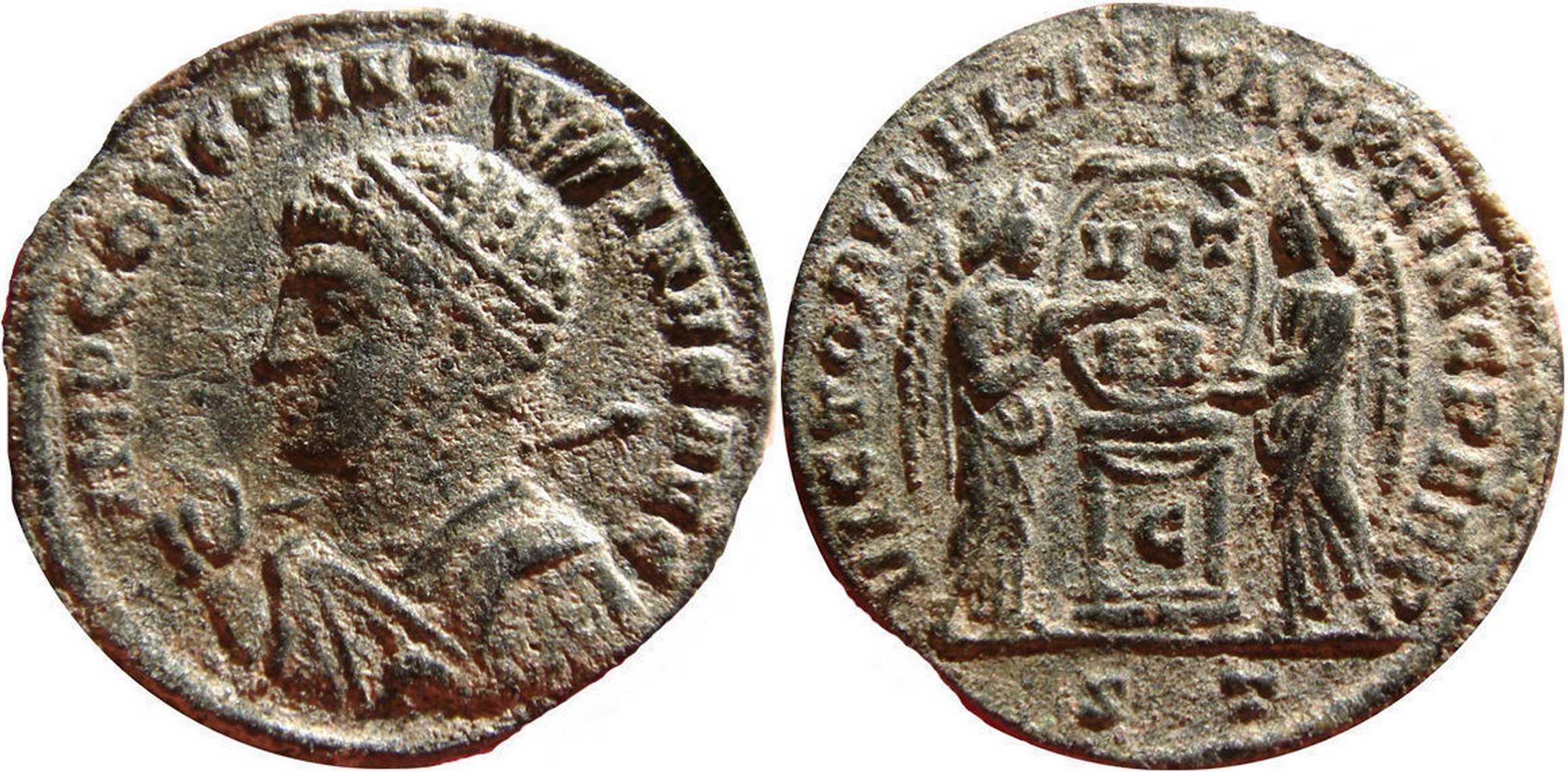 IMPCONSTANT-INVSAVG [IMP CONSTANTINVS AVG]; bust l., high-crested helmet, cuir., spear across r. shoulder.
