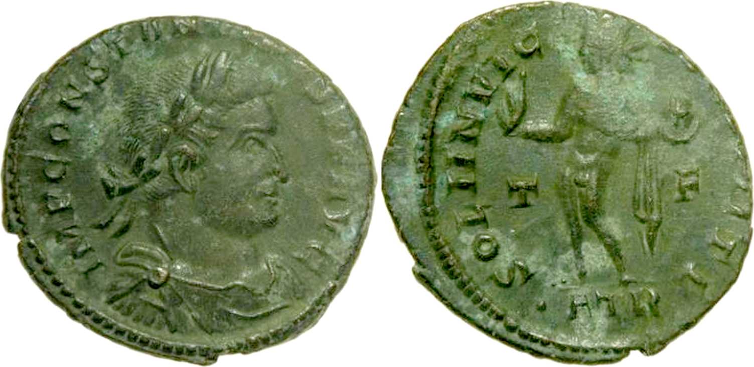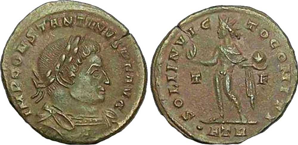 SOLIINVIC-TOCOMITI [SOLI INVICTO COMITI]; Sol rad., stg. l., raising r. hand, globe in l., chlamys across l. shoulder. T in left field, F in right field. ATR in exergue.