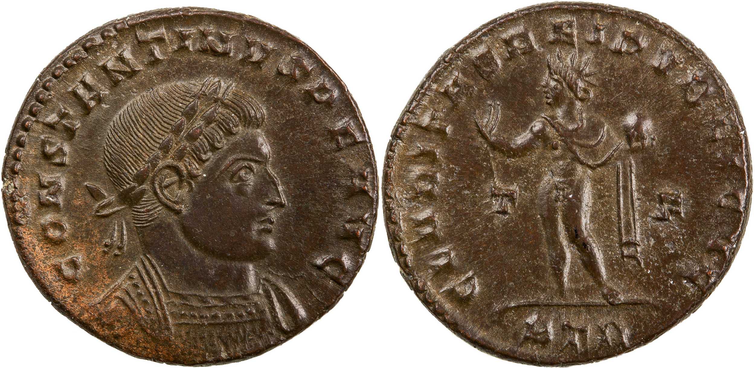 CONSTANTINVSPFAVG [CONSTANTINVS P F AVG]; bust r., laur., cuir.