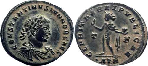 CONSTANTINVSIVNNOBCAES [CONSTANTINVS IVN NOB CAES]; bust r., laur., dr., cuir.