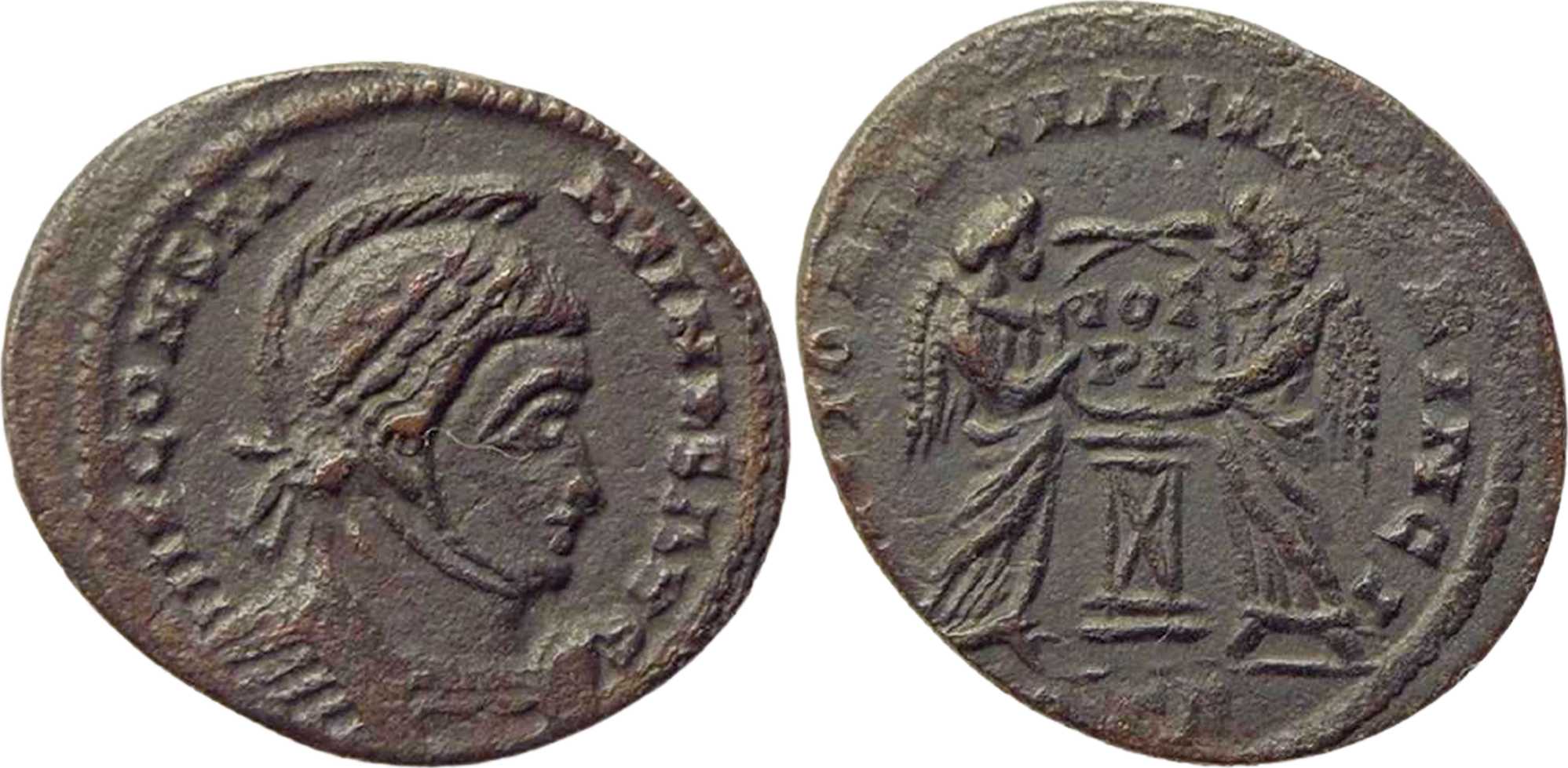 [VI]CTORIAELAETA[EP]RINCI [VICTORIAE LAETAE PRINCI (sic!)]; two Victories stg., facing one another, together holding shield inscribed VOT/PR on altar. [PT]R in exergue.