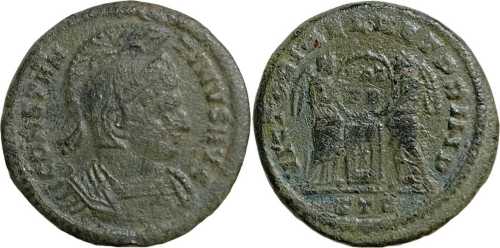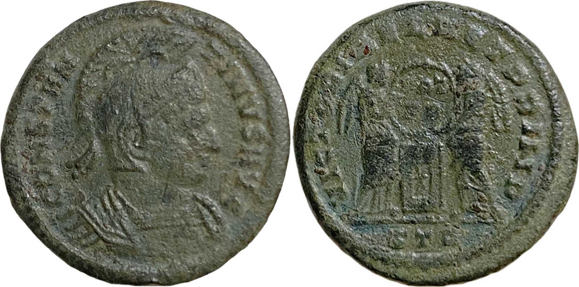 CONSTAN-TINVSAVG [CONSTANTINVS AVG]; bust r., helmeted, cuir. [D2].