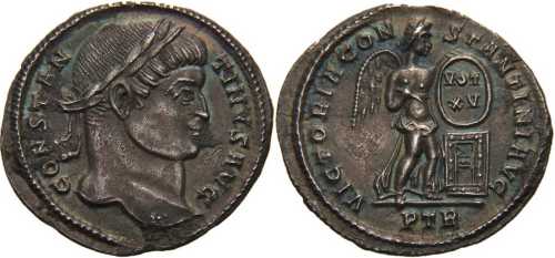 VICTORIACON-STANTINIAVG [VICTORIA CONSTANTINI AVG]; Victory stg. r., inscribing VOT/XV on shield set on altar. PTR in exergue.