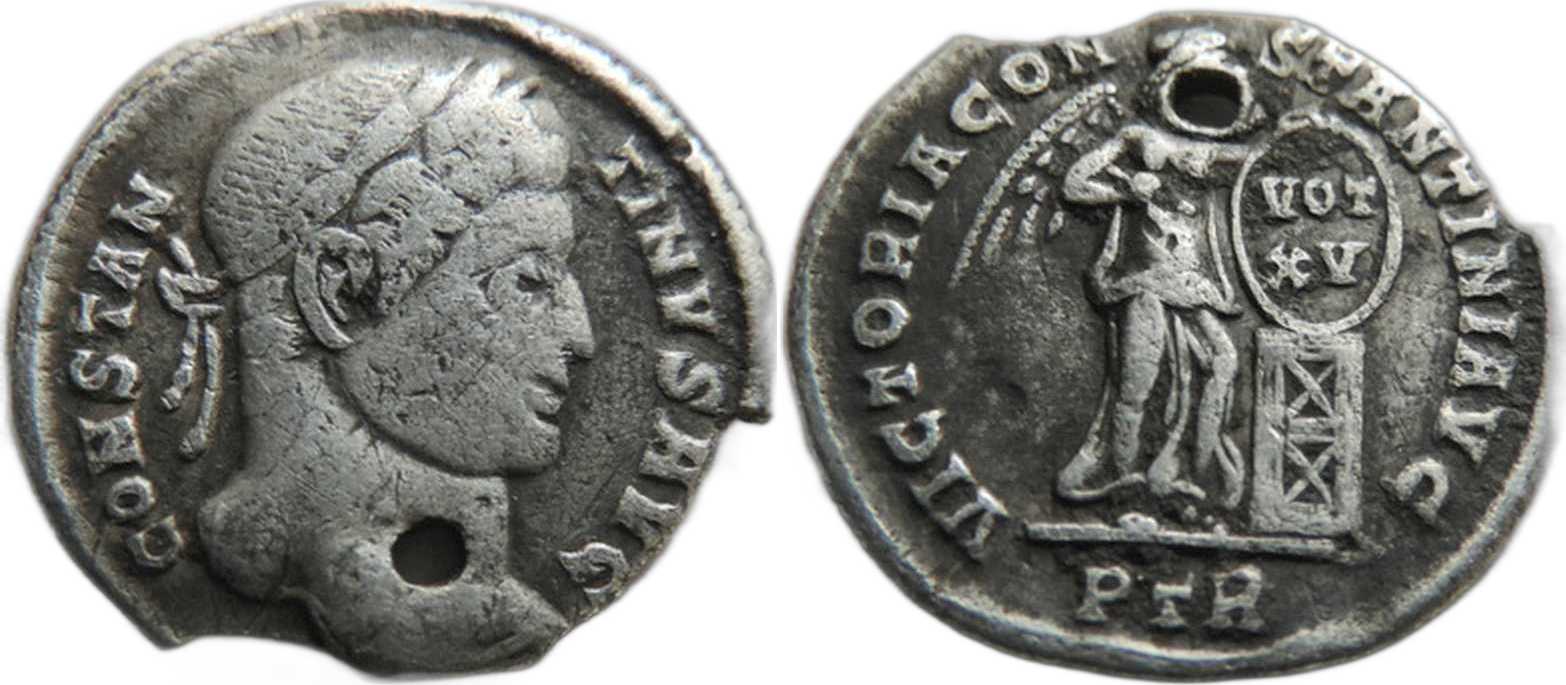 UNLISTED ISSUE. Minted probably in 316-321 but no Treveran silver is attested in RIC for this period. Note that it is not clear whether VOT XV refers to vota suscepta or to vota soluta. Specimen could be listed after TRIER 248.