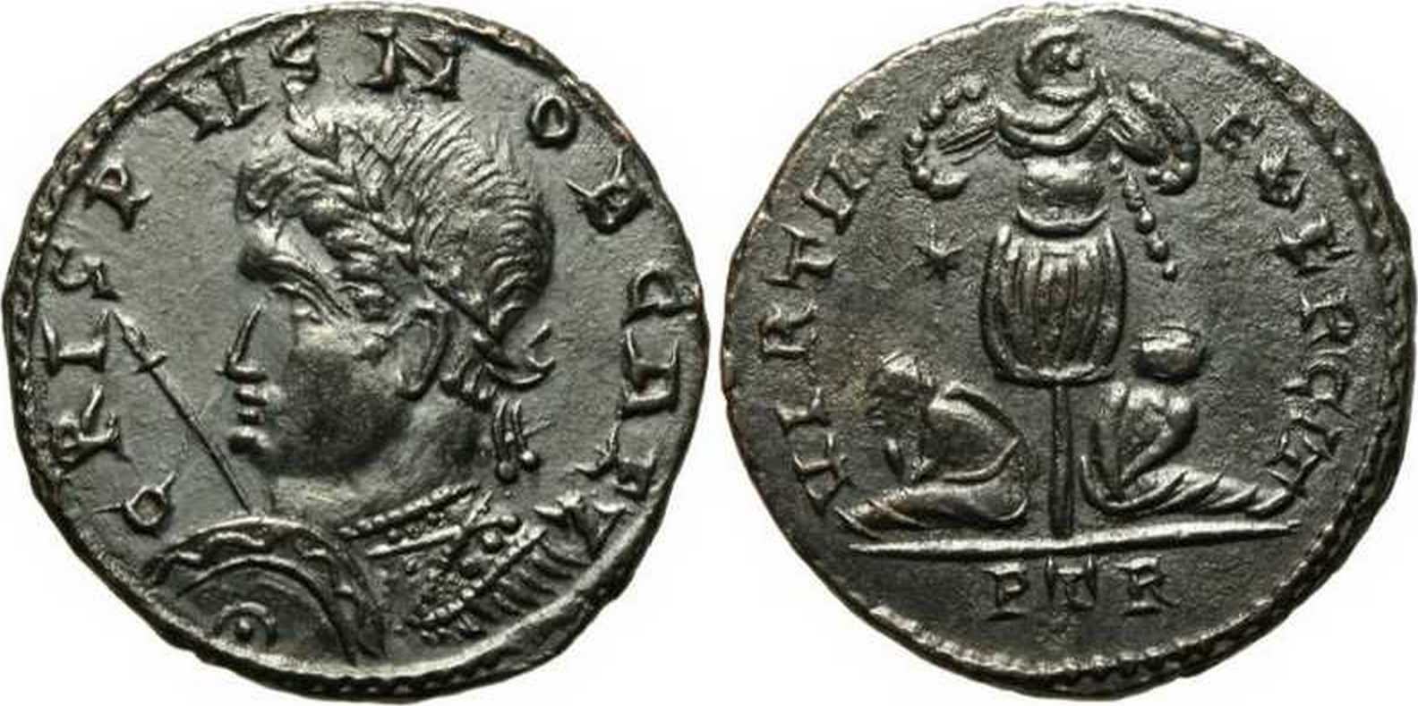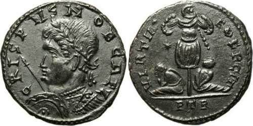 CRISPVSNOBCAES [CRISPVS NOB CAES]; bust l., laur., cuir. with spear pointing forward, shield on l. arm [G8 l.].