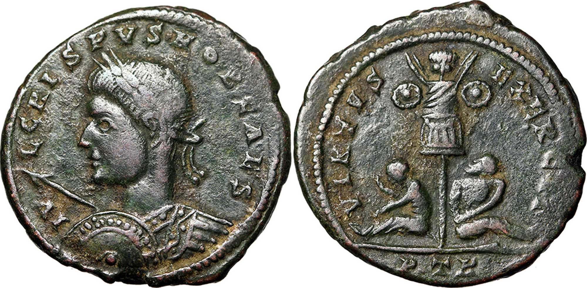 IV-LCRISPVSNOBCAES [IVL CRISPVS NOB CAES] [5a]; bust l., laur., cuir. with spear pointing forward, shield on l. arm.