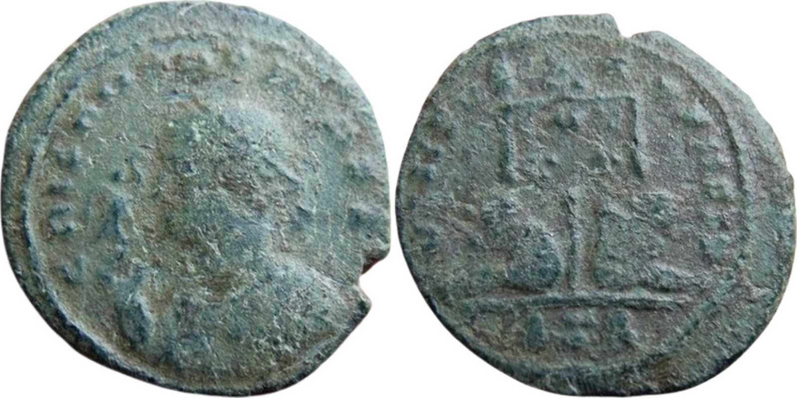 UNLISTED BUST TYPE - I1 l. Not attested for obv. legend 5b (p. 188). For varieties of bust types I1 and I2 see CORRIGENDA, VOL. VII, p. 89-90. Coin should be listed after TRIER 269.