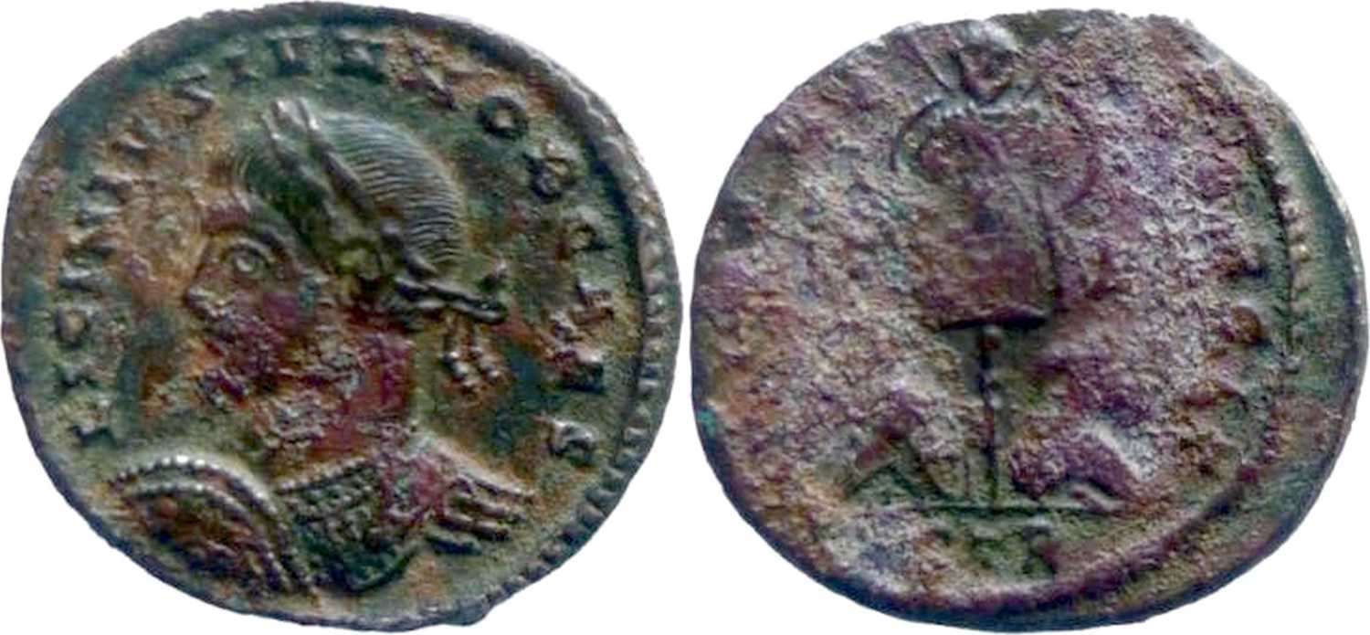 UNLISTED BUST TYPE - G8 l. Not attested for obv. legend 6a (p. 189), but cf. TRIER 284. Note that tip of spear is hardly visible and this attribution could be questioned. Coin should be listed after TRIER 287.