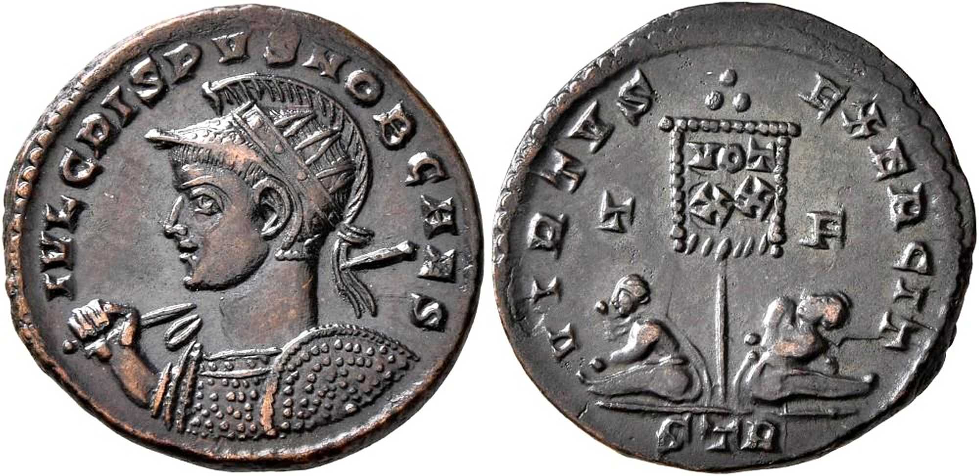 IVLCRISPVSNOBCAES [IVL CRISPVS NOB CAES]; bust l., rad. helmet, cuir., sceptre across r. shoulder, shield on l. arm.