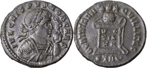 IVLCRISPVSNOBCAES [IVL CRISPVS NOB CAES]; bust r., laur., wearing trabea, sceptre in r. hand, Sol on globe in l. hand.