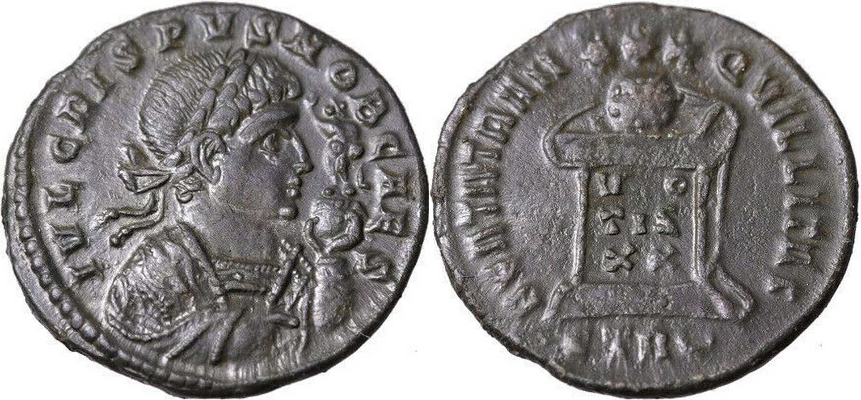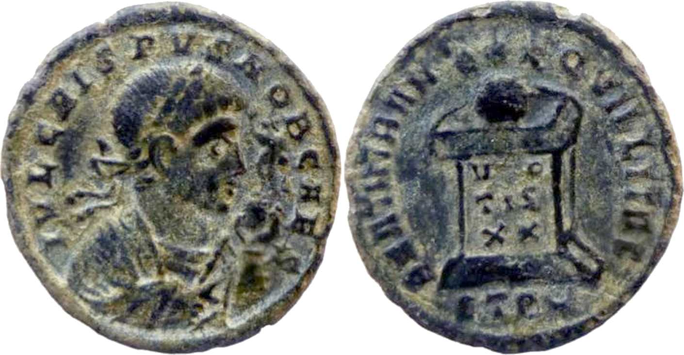 UNLISTED BUST TYPE. Not attested for obv. legend 5a (p. 199). Crispus is dressed as a priest of Sol and is holding sceptre and Sol on globe (see comment on this bust type in RMBT, p. 22; with incorrect suggestion that this bust is attested only for Constantine II). Listed in RMBT (p. 58, no. 200a). Should be listed in RIC after TRIER 397.