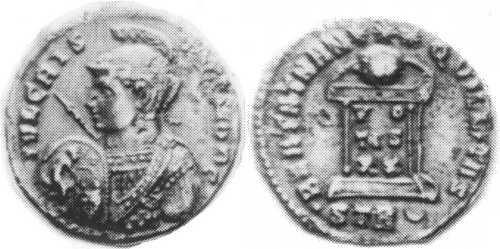 IVLCRIS-[PVS]NOBC [IVL CRISPVS NOB C]; bust l., helmeted., cuir., spear pointing forward, shield [H4 l.].