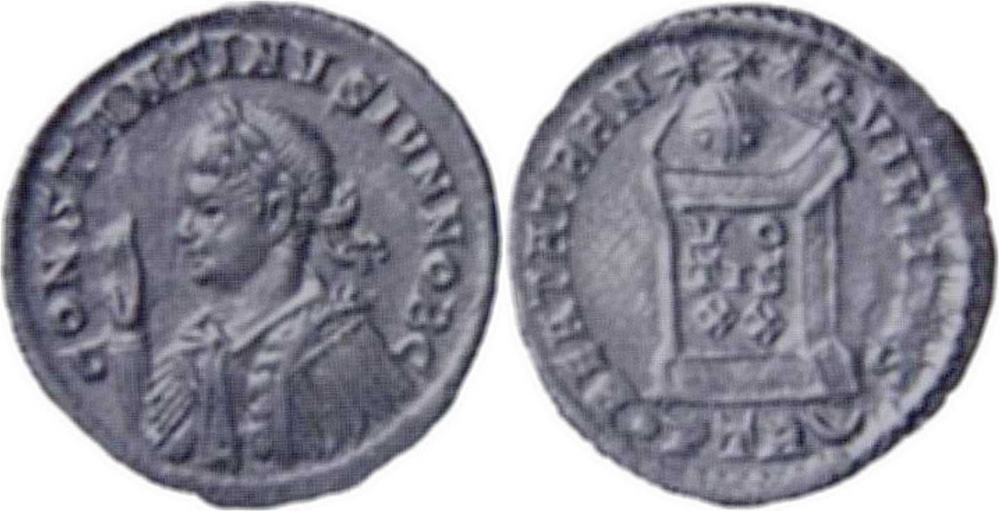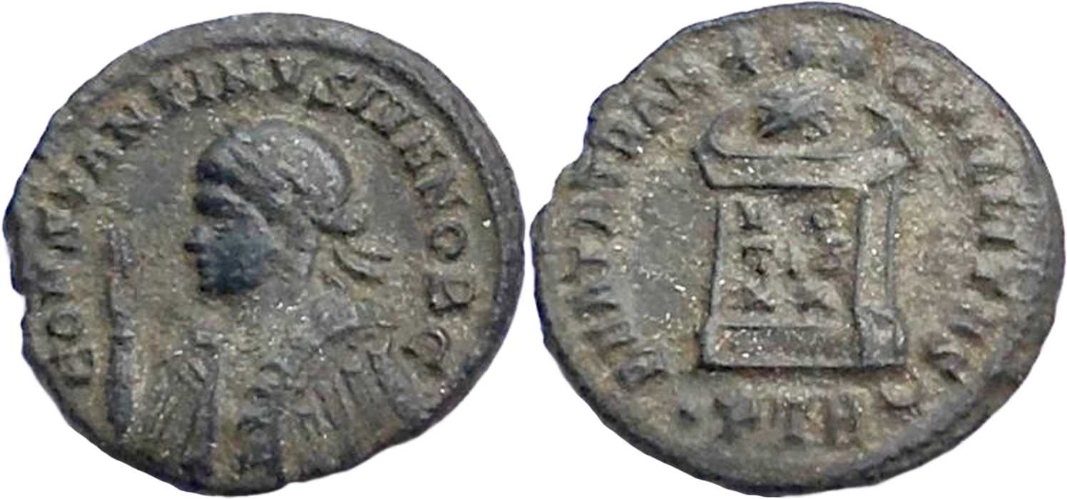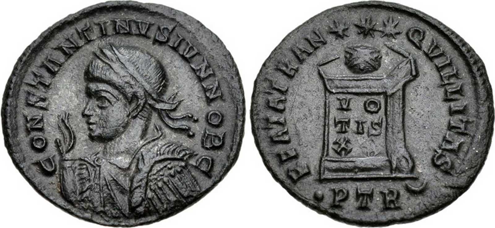 CONSTANTINVSIVNNOBC [CONSTANTINVS IVN NOB C]; bust l., laur., dr., cuir., raising r. hand [L1 l.].