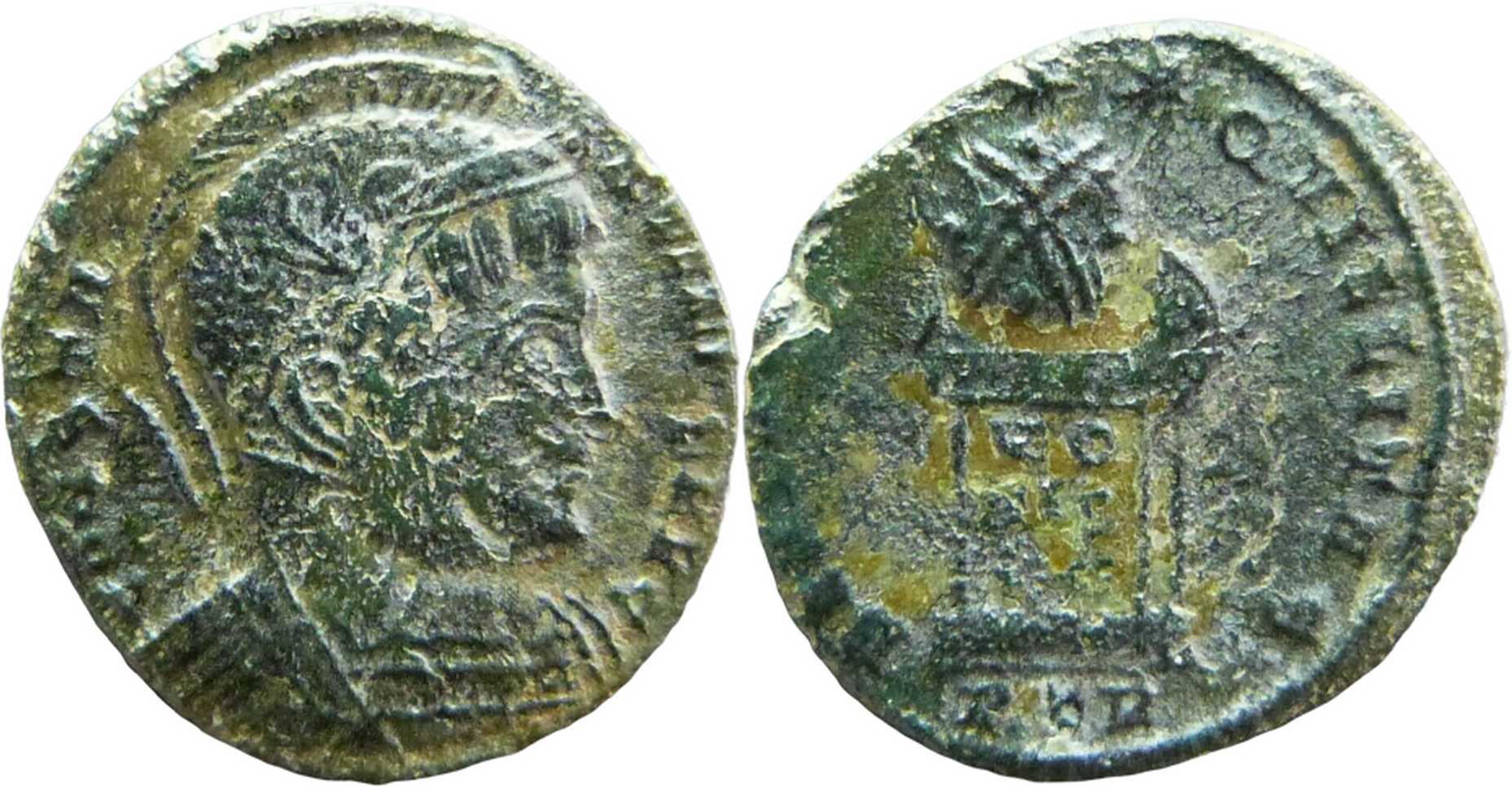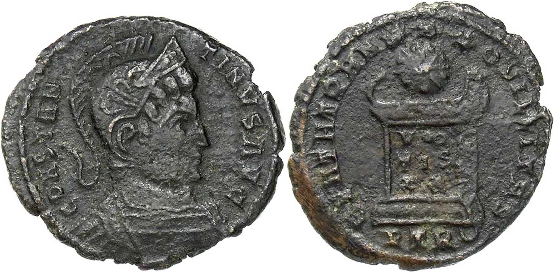 CONSTAN-TINVSAVG [CONSTANTINVS AVG]; bust r., helmeted, cuir. [D2].