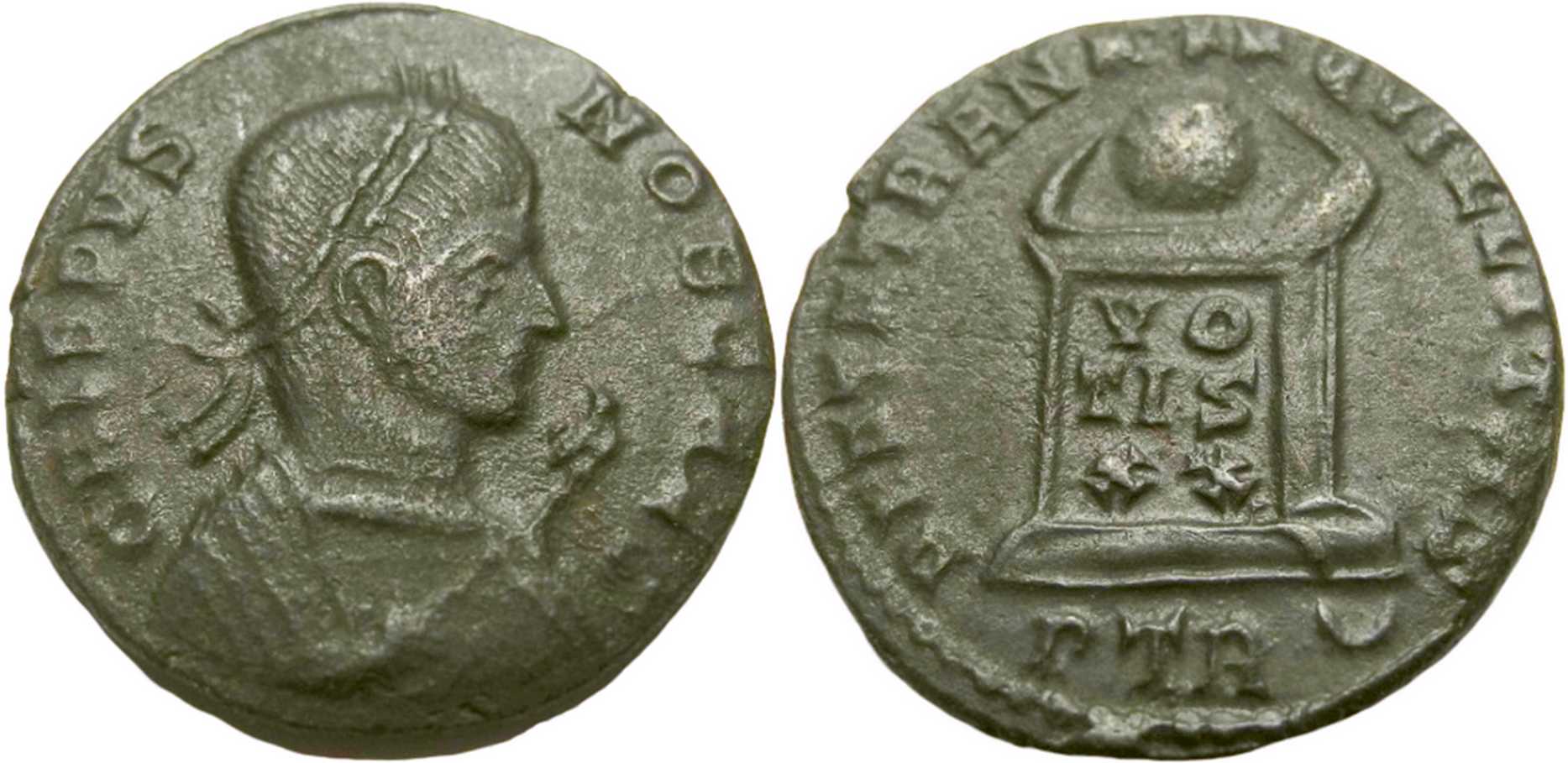 CRISPVS-NOBCAES [CRISPVS NOB CAES]; bust r., laur., wearing trabea, eagle-tipped sceptre in r. hand.