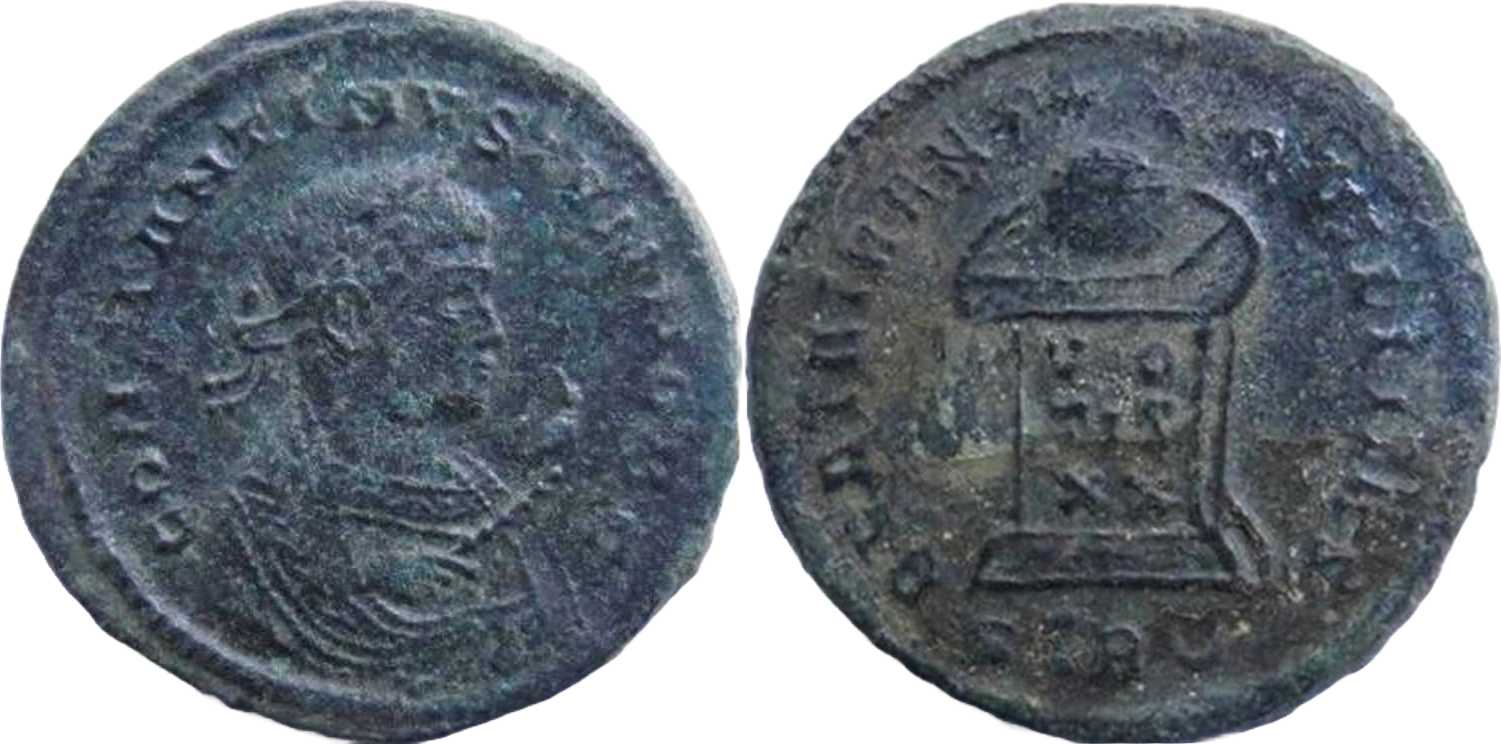 BEATATRAN-QVILLITAS [BEATA TRANQVILLITAS]; globe set on altar inscribed VO/TIS/XX; above, three stars. STR crescent in exergue.