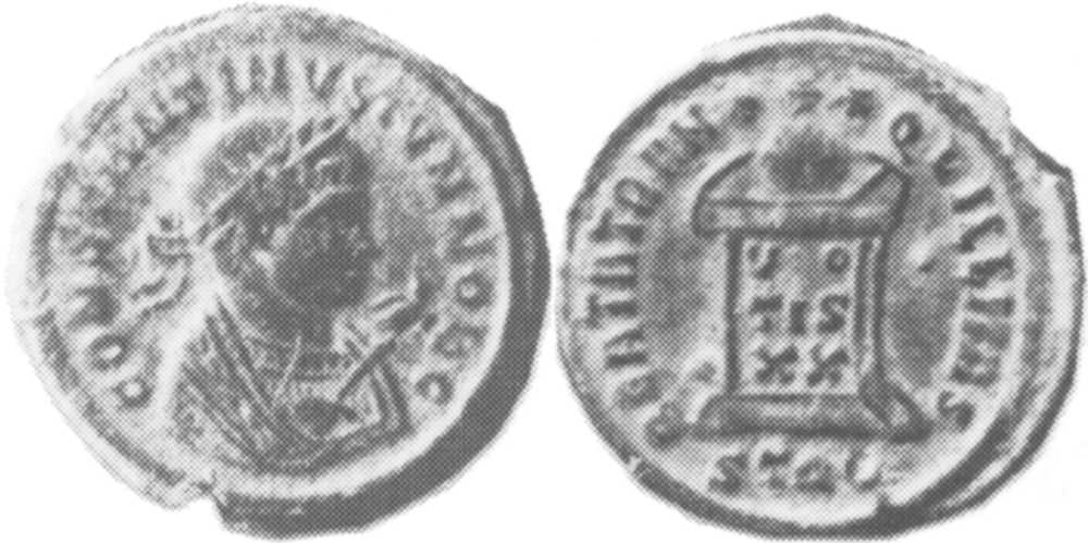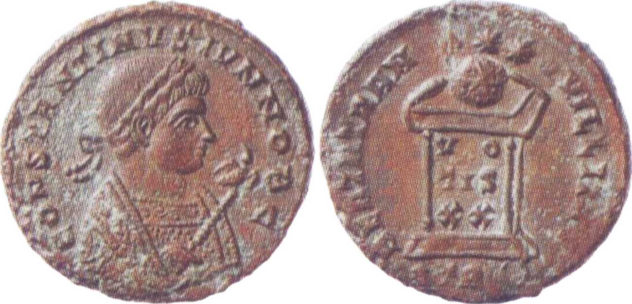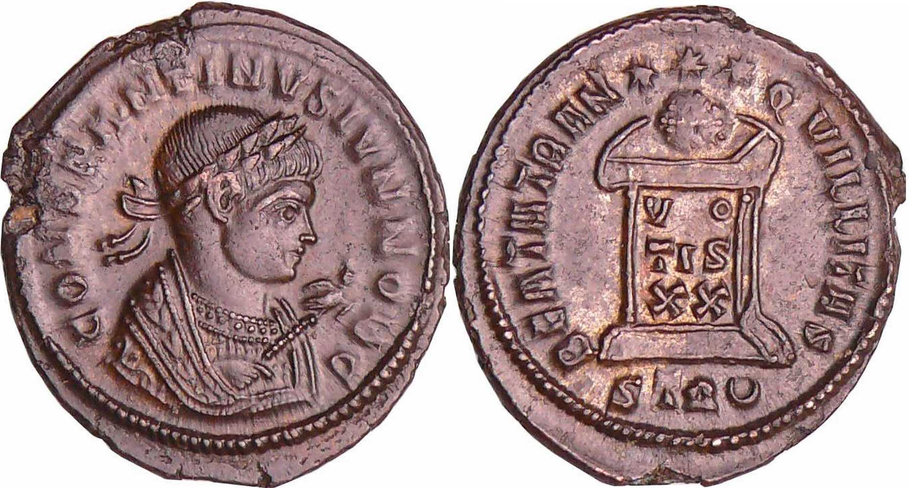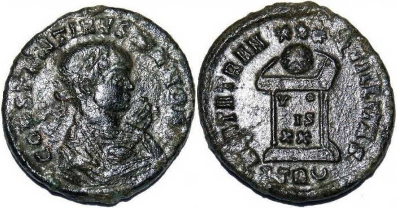 CONSTANTINVSIVNNOBC [CONSTANTINVS IVN NOB C]; bust r., laur., wearing trabea, eagle-tipped sceptre in r. hand [K3].