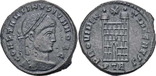 PROVIDEN-TIAECAESS [PROVIDENTIAE CAESS]; camp gate with two turrets, no doors, star above. PTR in exergue.