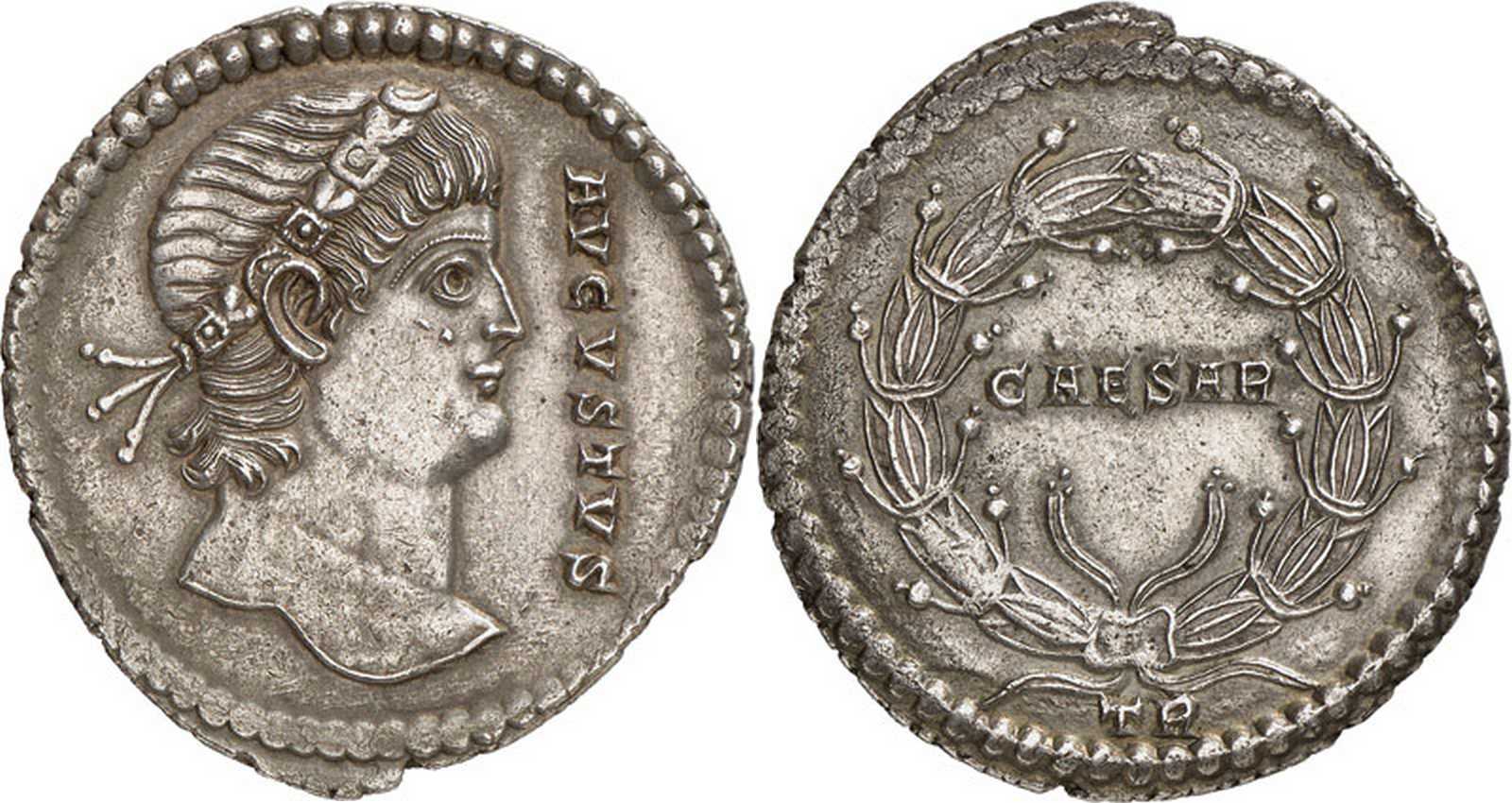 AR medallion of 4 heavy siliquae. Weight 14.10 g. Sold on Numismatik Lanz auction 26 (lot 907) in December 1983 for DM 105,000; sold on Numismatica Ars Classica auction 15 (lot 486) in May 1999 for CHF 38,000; sold on Numismatica Genevensis SA Auction 5 (lot 296) in December 2008 for CHF 70,000.