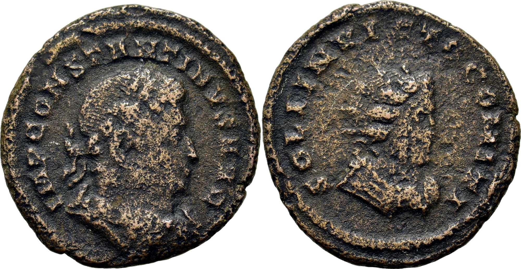 UNLISTED ISSUE. According to the preliminary study published by Genio popvli romani, not only T|F/PTR emission was continued after the 1/96 reduction [RIC VII TRIER 39-60] but also the emission of unmarked folles with bust of Sol on reverse [RIC VI TREVERI 886-895]. The main problem is to distinguish this later part from the earlier one, issued on the 1/72 standard. As Sutherland wrote in RIC VI (footnote 1 on p. 227): "It is not always easy to distinguish this earlier and heavier unmarked series from the lighter one, with the same types, which appeared after Maximinus' death: the weight-peaks are quite distinct from each other, but the light 'heavies' and the heavy 'lights' inevitably tend to overlap".