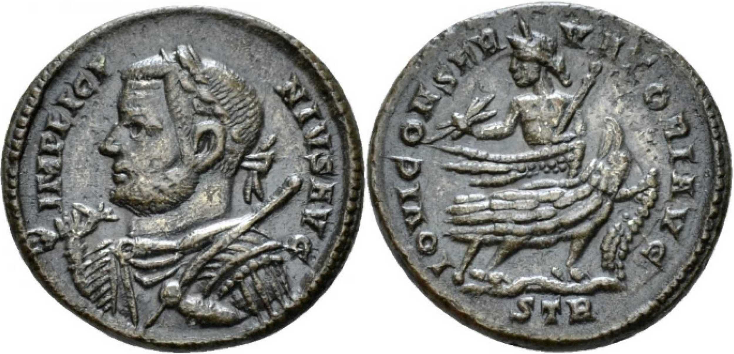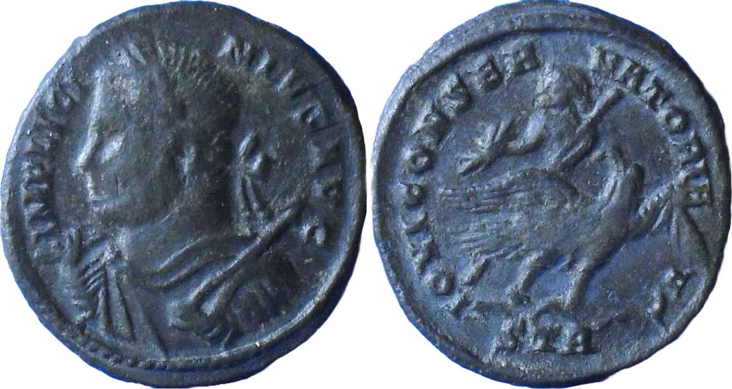 UNLISTED OFFICINA S AND BUST VARIETY. Specimen similar to TRIER 211 except for spear across l. shoulder on the obv. instead of sceptre. See also CORRIGENDA, VOL. VII, p. 182. Note that also on obv. Emperor is holding thunderbolt in r. hand, not mappa.