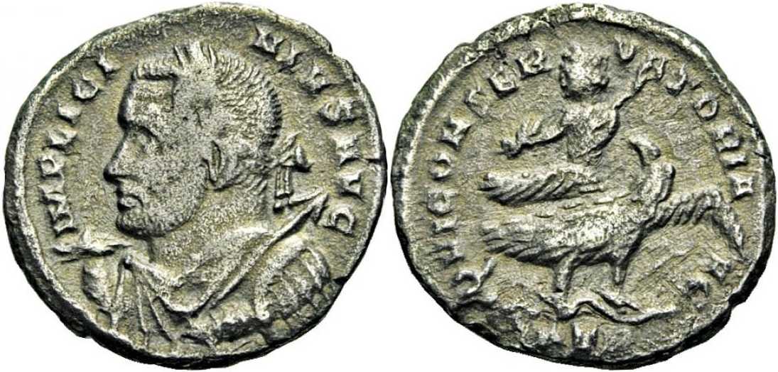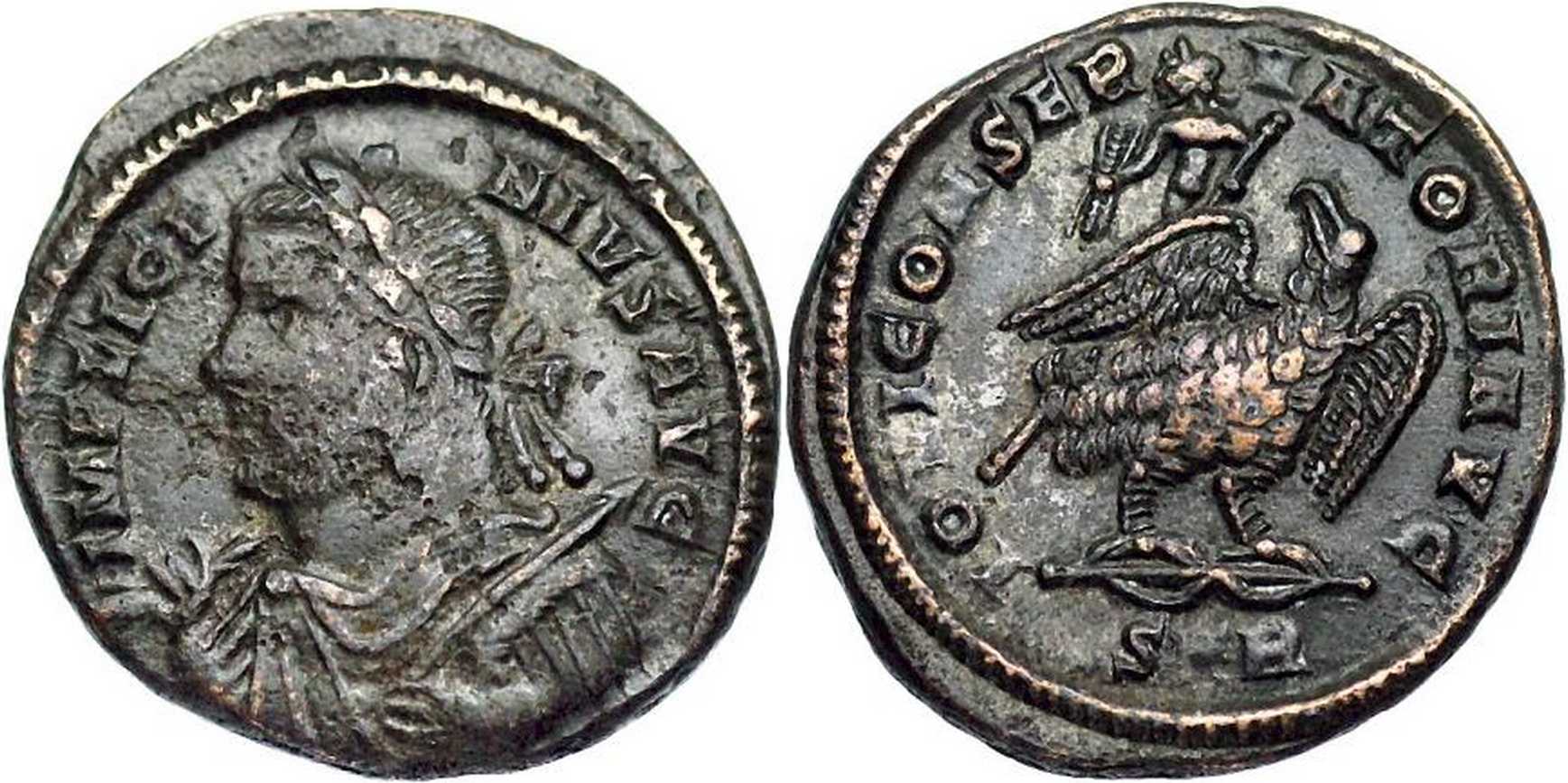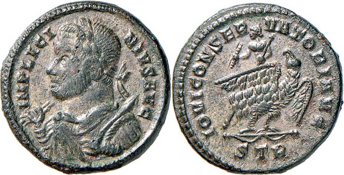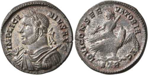 IMPLICI-NIVSAVG [IMP LICINIVS AVG]; bust l., laur., dr., cuir., thunderbolt in raised r. hand, spear across l. shoulder.