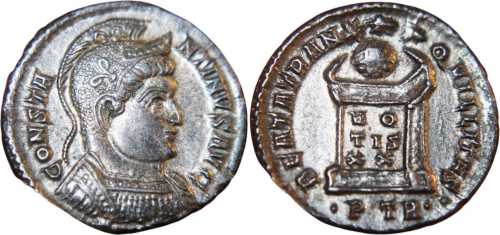 CONSTA-NTINVSAVG [CONSTANTINVS AVG]; bust r., helmeted, cuir.