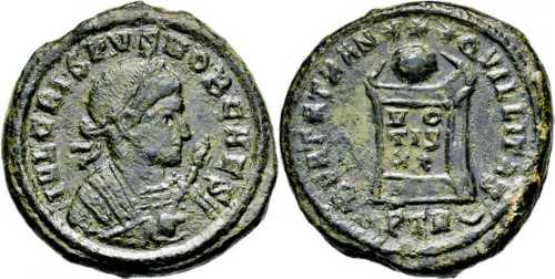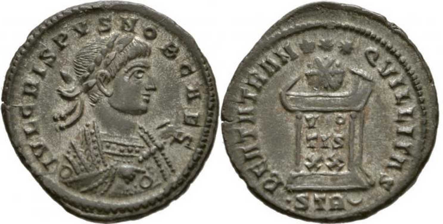 IVLCRISPVSNOBCAES [IVL CRISPVS NOB CAES]; bust r., laur., wearing trabea, eagle-tipped sceptre in r. hand.