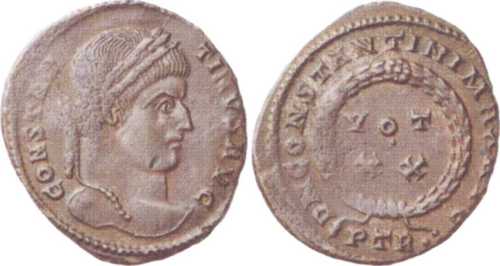 DNCONSTANTINIMAXAVG [D N CONSTANTINI MAX AVG]; laurel wreath enclosing VOT/XX. PTR in exergue.