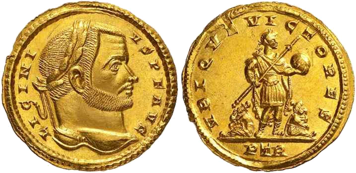 VBIQVEVICTORES [VBIQVE VICTORES]; prince stg. r., r. holding transverse spear, l. globe, captive std. on ground on either side. PTR in exergue.